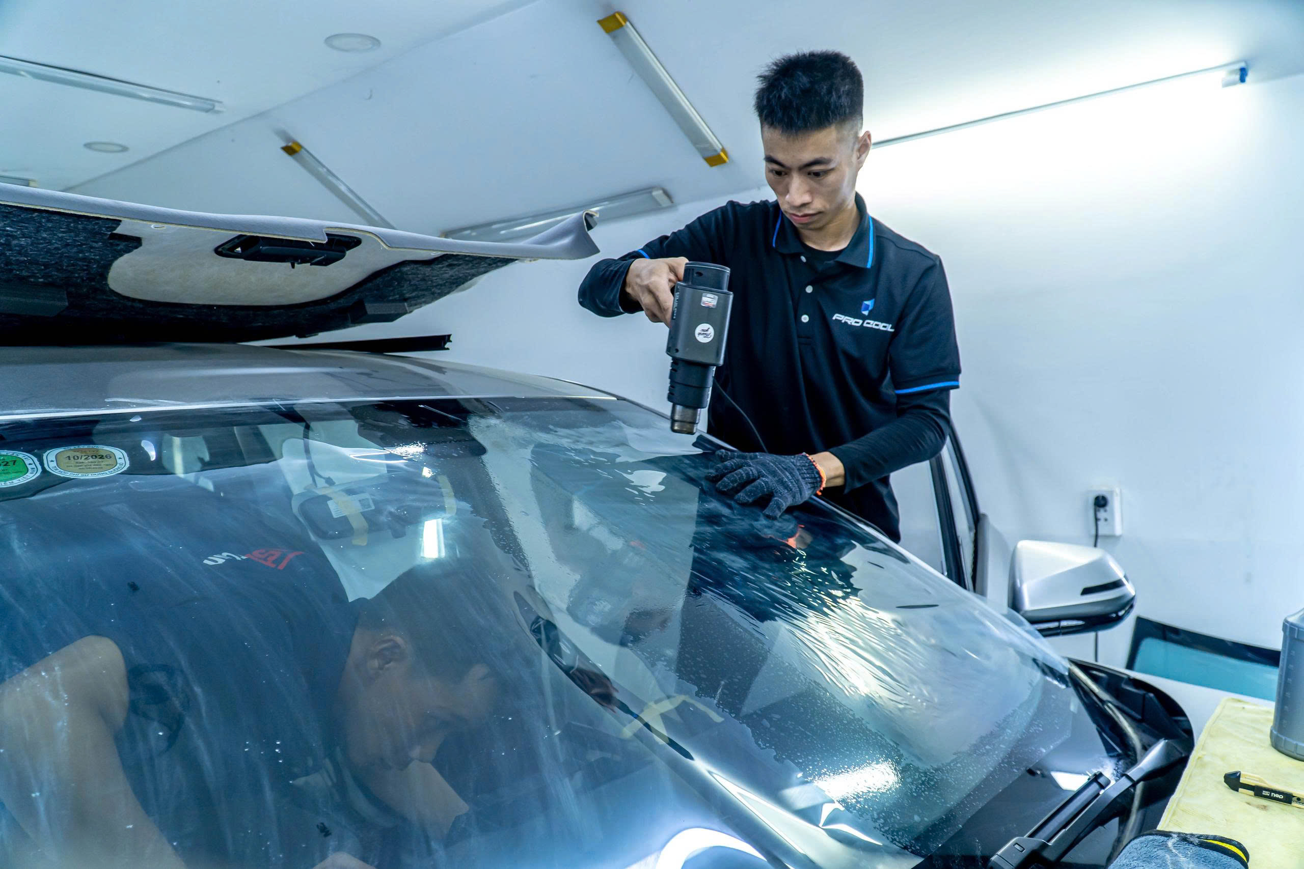 - Tạo form bên ngoài: Tấm phim cách nhiệt được đặt lên mặt ngoài của kính. KTV sẽ dùng súng sấy nóng chuyên dụng để tạo hình (ép form) cho tấm phim cong theo đúng hình dạng của mặt kính xe Limo Green. Việc này đặc biệt quan trọng với kính lái có độ cong lớn và kính lưng.
